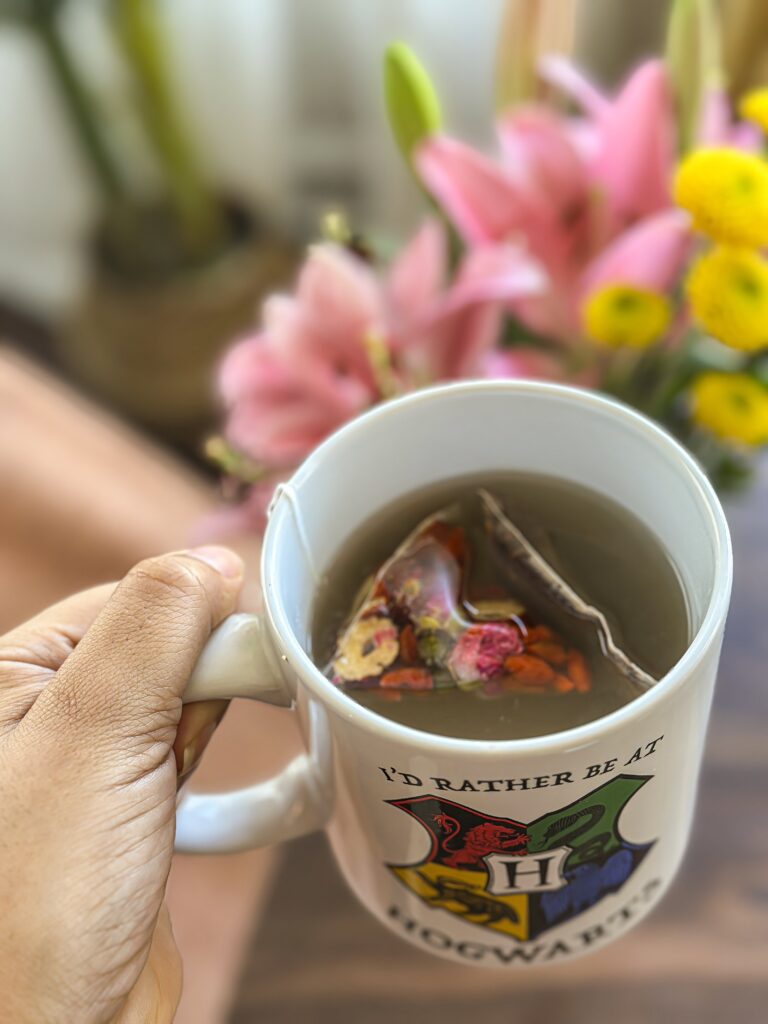 1. Add the tea bag, goji berries, and chopped dates to a teacup or jar.